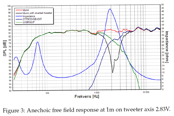 As seen in the figure the average sensitivity is 85dB and the response lies within ± 1.5dB. The black curve shows the response with the tweeter connected with opposite polarity. The deep and symmetrical notch, when the tweeter is connected with inverse polarity, shows that the drivers are in-phase across the whole crossover region.