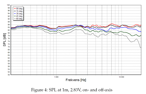 The off-axis response of the Idunn is shown above. Here we really see the beauty of the DXT tweeter. The power response is perfectly smooth throughout the entire frequency range even at 60 off-axis. This gives a huge sweet spot, while still allowing for pin-point imaging. It also keeps the tonal balance of the loudspeaker all over the listening room.