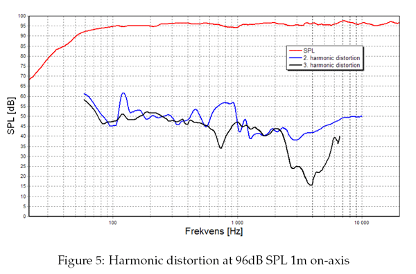 The figure below shows the 2nd and 3rd order harmonic distortion with an output of 96dB at 1m. The overall distortion is very low and makes the reproduced music very clean and without coloration.