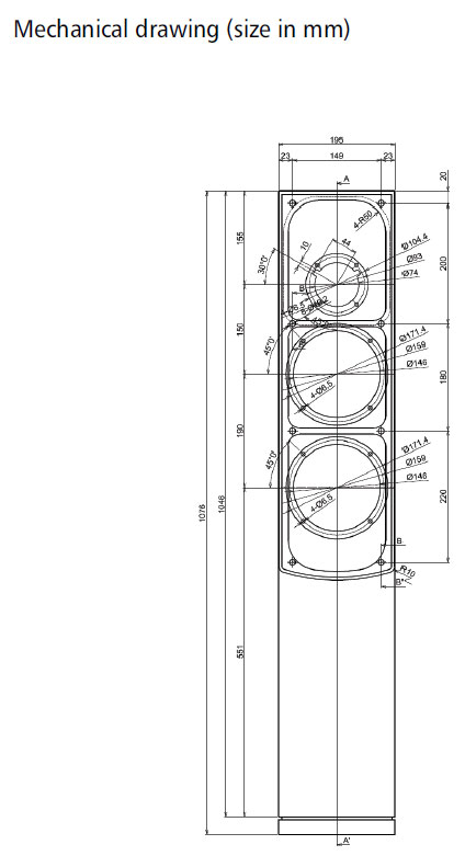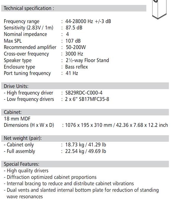The midbass drivers are the SB17MFC35-8 MFC (mineral filled PP cone) that give a tight/firm bass when tuned correctly, to go along with crisp midrange reproduction. We are confident that PP-cones have never sounded better. With two 6” drivers you get enough quality bass in room sizes of 50m2/540sf or larger.