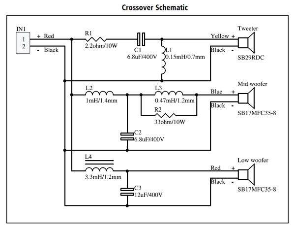 The crossovers are factory assembled by SB Acoustics using Jantzen components. The lower woofer uses a low resistance iron core inductor, and the upper midwoofer 15awg and 16awg air core inductors. The series tweeter capacitor is a Cross-Cap, and upgrade options are available from the drop down menu. The circuit boards are pre-wired and terminated with slide on quick connects for the drivers. The crossover input wires are pre-tinned for a quick solder to the binding posts.