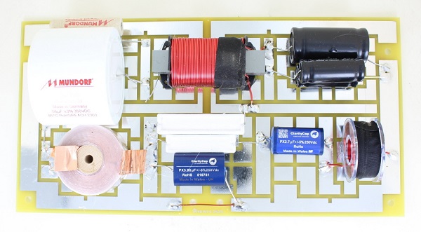 The tweeter and midrange have Mundorf MResist Supreme Resistors in line with the drivers. The series tweeter cap is the Mundorf Supreme EVO Oil Capacitor 4.7 mfd. The series midrange cap is the Mundorf 56mfd EVO Oil Capacitor and the series coil is the Mundorf MCoil Foil 16 awg air core 0.56 mH. An ultra low DCR 3.3 mH Steel Laminate Inductor 15 AWG is used on the woofers. Upgrade options are available from the drop down menu.