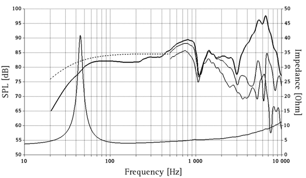 The frequency responses above show measured free field sound pressure in 0, 30, and 60 degrees angle using a 22L closed box. Input 2.83 Vrms, microphone distance 0.5m, normalized to SPL 1m.The dotted line is a calculated response in infinite baffle based on the parameters given for this specific driver. The impedance is measured in free air without baffle using a 2V sine signal.